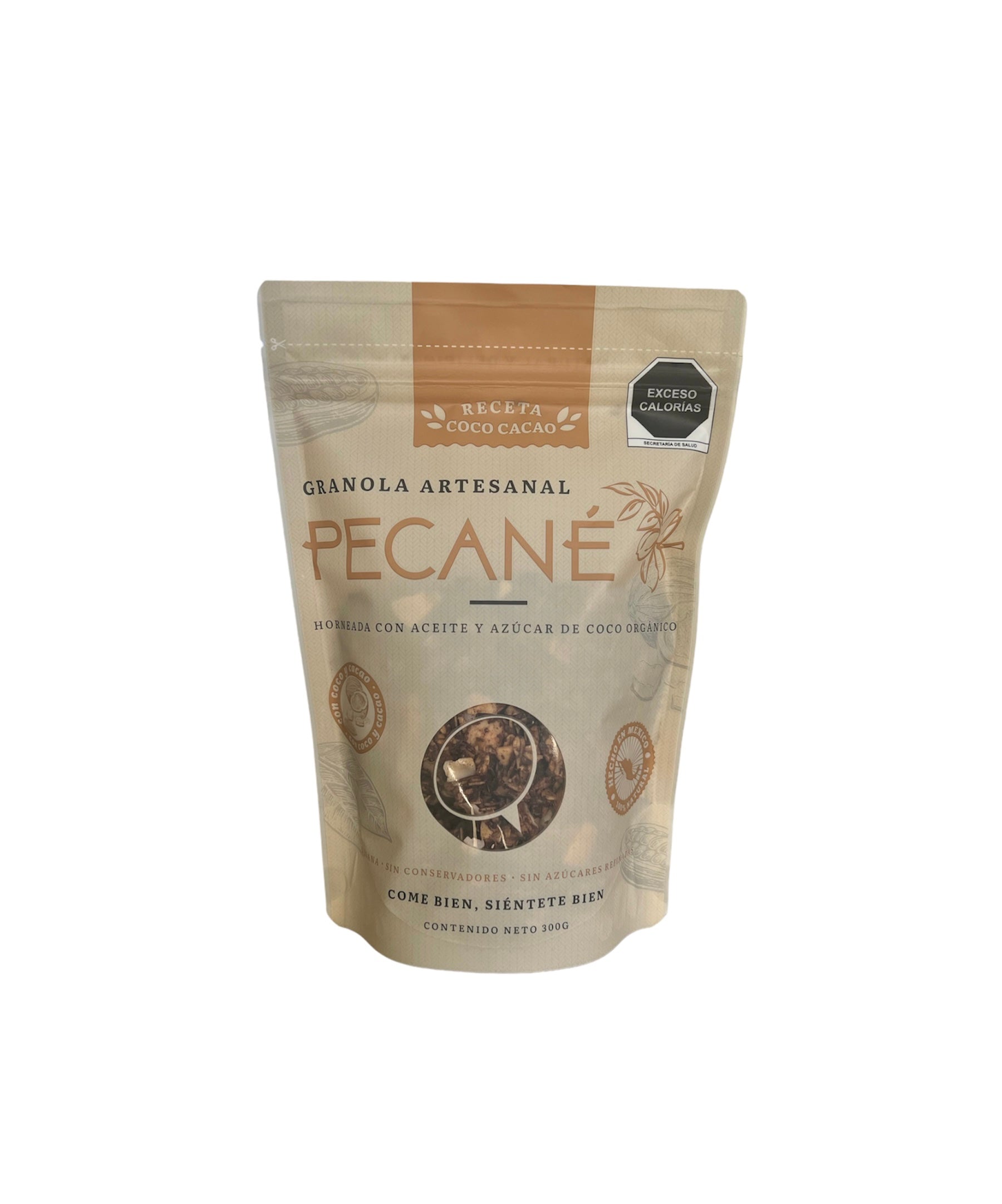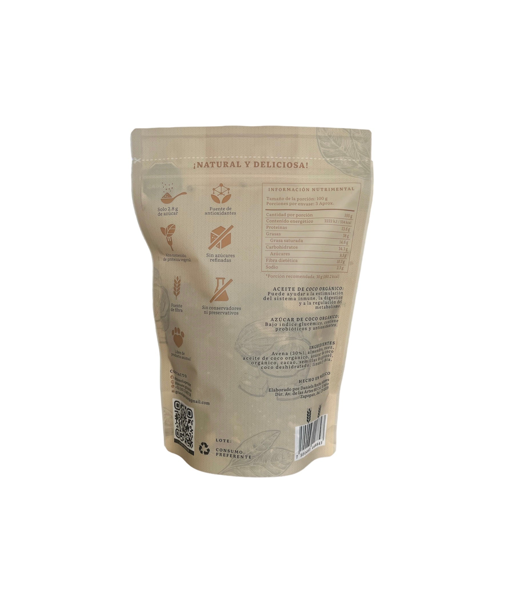 Avena, Almendra, Nueces Pecanas, Coco Deshidratado, Aceite de Coco Orgánico, Cacao, Azúcar de Coco Orgánica, Semillas de Girasol, Chía, Linaza
